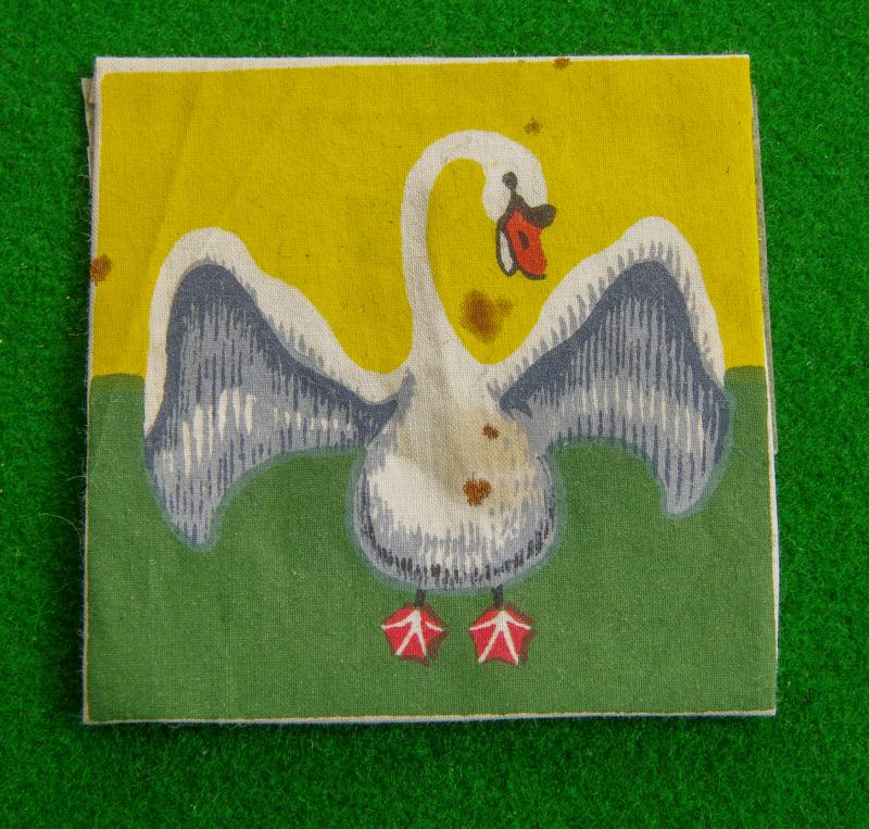 Scarce WW II printed example of the arm holding King Arthur's sword, {Excalibur} above the blue waves on a black backing above a single dark green, "Rifles" arm of service strip still affixed to a section of battledress material. read more