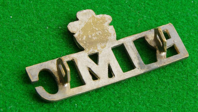 Scarce bi / metal shoulder title, " Prince of Wales's Plumes / R I M C ". Worn at the Rashtriya Indian Military College. {Possibly Rajkumar College?}