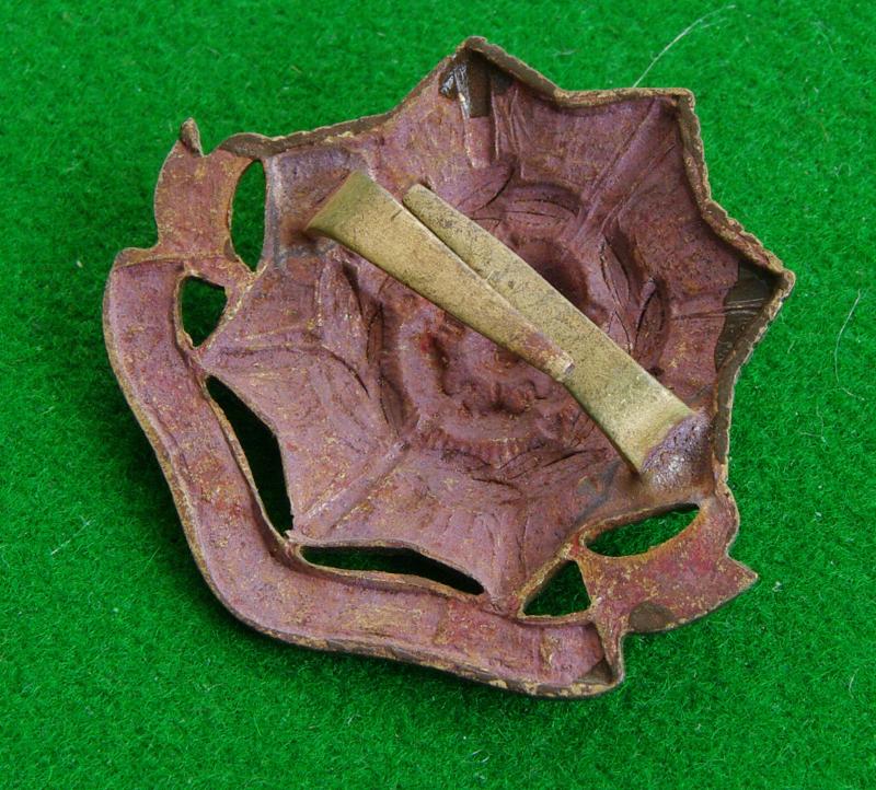 Officers bronze service dress cap badge with two blades to the reverse. The Yorkshire Rose within a wreath of laurel on a multi-rayed star above the furled title scroll, " East Yorkshire" {This is the " Blunt Star" pattern, see also my item-30271}
