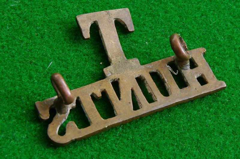 Scarce WW I brass shoulder title, " T / Hunts". Worn by the Huntingdonshire Cyclist Battalion. {Loops and "T" slightly twisted}