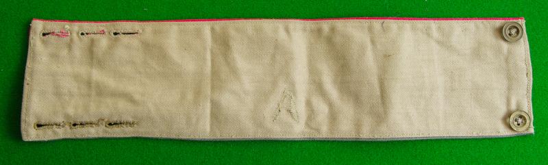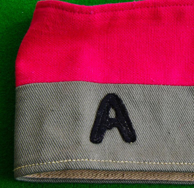 Adjutant-General's Staff armband in scarlet over khaki green with the embroidered letter, " A " to the lower section. Pale kd backing with two button fitting to the reverse.