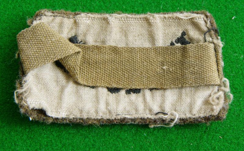 Scarce WW II black on khaki embroidered shoulder strap slip-on, " Herts" with canvas loop to the reverse.