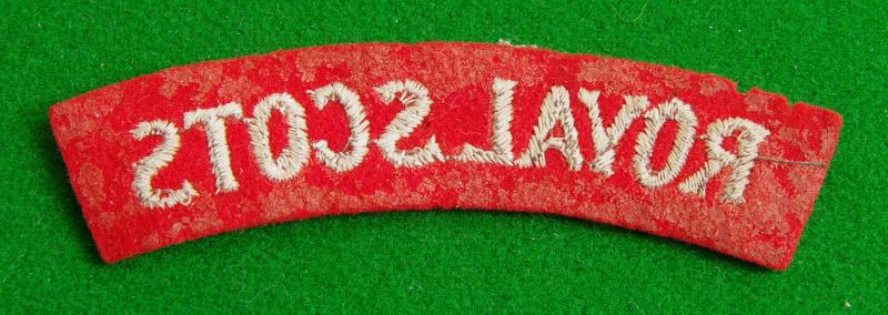 White on red embroidered early pattern serifed shoulder title, " Royal Scots". {Two moth nips to top edge}