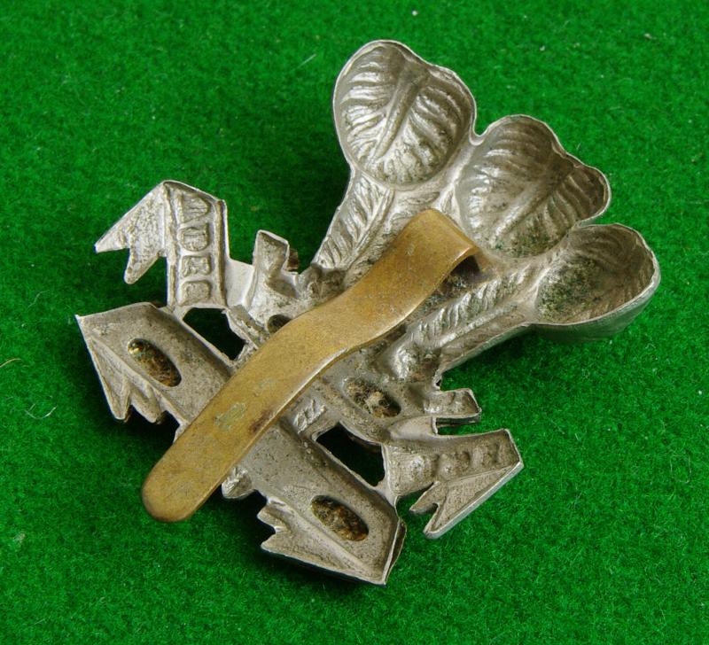 Bi / metal cap badge with slider fitting to the reverse. The Prince of Wales's plumes above the angular title scroll, " The Leinster"