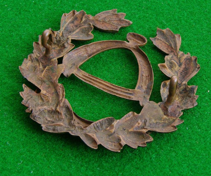 Bronzed-brass other ranks cap badge with two loops to the reverse worn by the 4th. {Bournemouth} Volunteer Battalion Hampshire Regiment. A New Forest dog-gauge to the centre of a wreath of laurel that bears the title, " 4th. V.B. Hants"