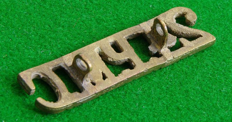 Brass shoulder title with two integral lugs to the reverse, " 24 P.M.C.". Worn by the 24th. Pack Mule Company Indian Army Service Corps.