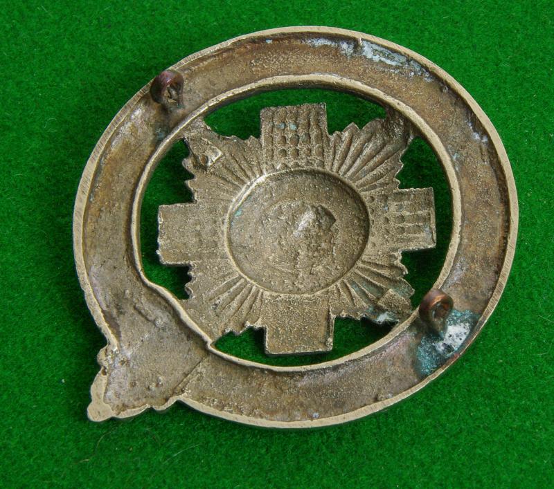 Die-cast white metal Pipers headdress badge with two loops to the reverse. The Star of the Order of the Thistle to the centre of a strap bearing the title, " Scots Guards"