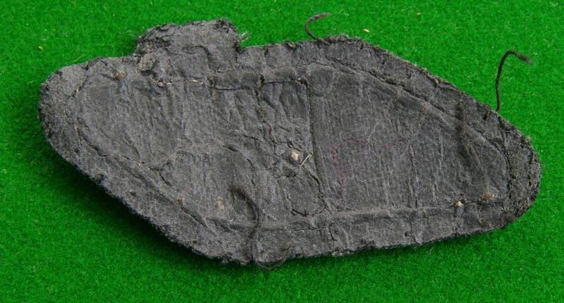 Bullion wire embroidered example of the tank crewman's full dress sleeve qualification badge. A WW I style tank on a black shaped backing.