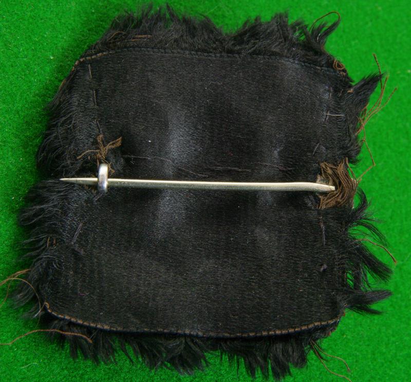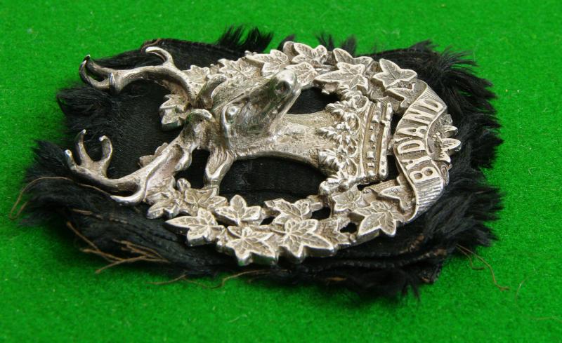 Fine quality officers hallmarked silver headdress badge with original heavy brooch pin fitting Edinburgh hallmarks for 1950 makers details for "A & J.S." retailers ? details for " A & D.N" and remains of silk rosette to the reverse. The stag's head in high relief within a wreath of ivy that carries the scroll, " Bydand"