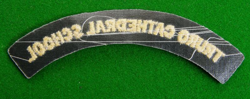 Embroidered in yellow on dark green shoulder title, " Truro Cathedral School"