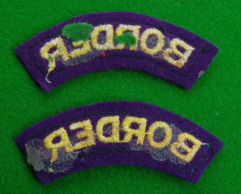 Pair of embroidered in yellow on green and purple shoulder titles, " Border" {Glued paper spots to reverse}
