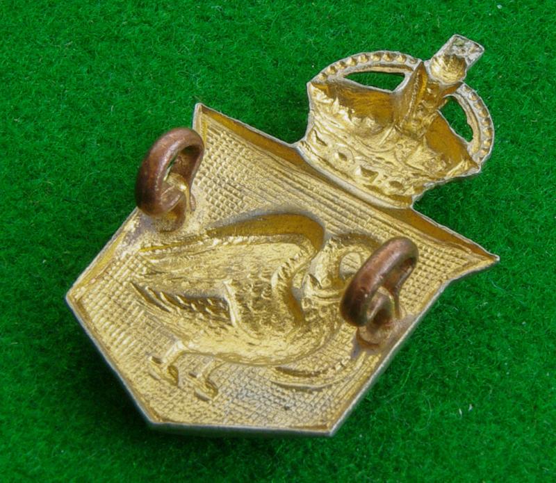 Scarce white metal king's crown cap badge with two loops to the reverse. The Swan from the County Arms on a crowned shield.