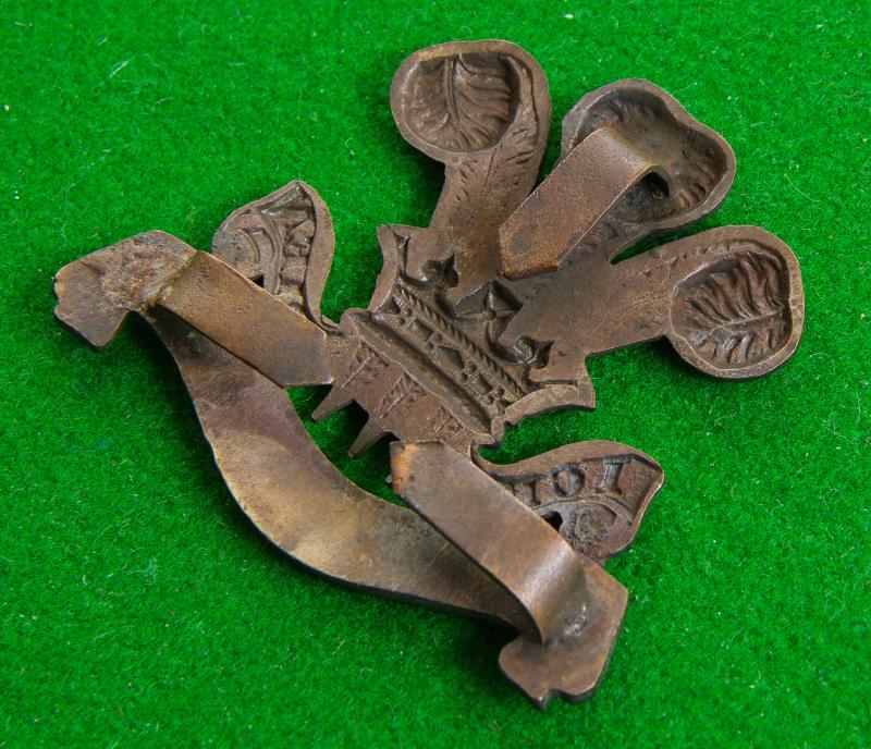 Scarce officers bronze service dress cap badge with three blades to the reverse. The Prince of Wales's plumes above the furled title scroll, " 3rd. Dragoon Guards"