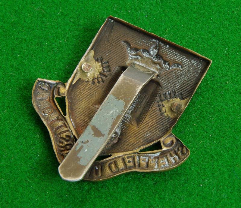 Brass cap badge with slider replacing the original loops to the reverse. A shield bearing the Arms of the University above the furled scroll, " Sheffield University O.T.C."