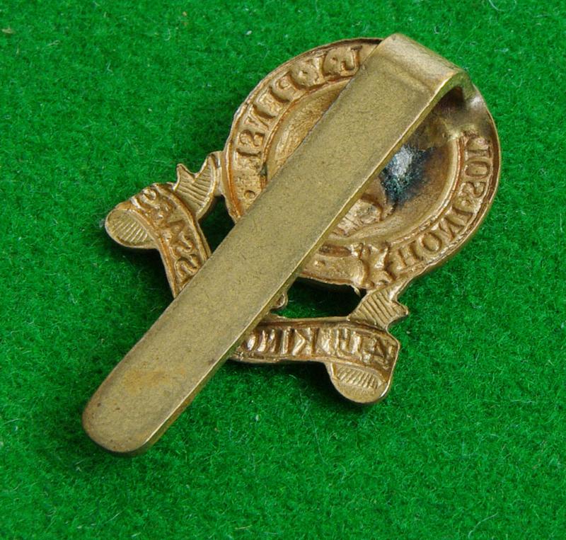 Small non-voided pattern king's crown cap badge with slider fitting to the reverse. The Royal Crest to the centre of a Garter Strap above the furled title scroll, " 14th. King's Hussars" {See my item 27226 for variant}