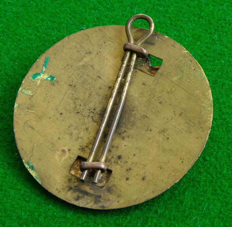 Scarce early pattern king's crown brass sleeve badge with two loops and original shaped brass back-plate to the reverse. The king's crown to the centre of a circlet bearing the motto, " Tria Juncta In Uno" on an eight-pointed star above the furled scroll, " Trained Soldier."