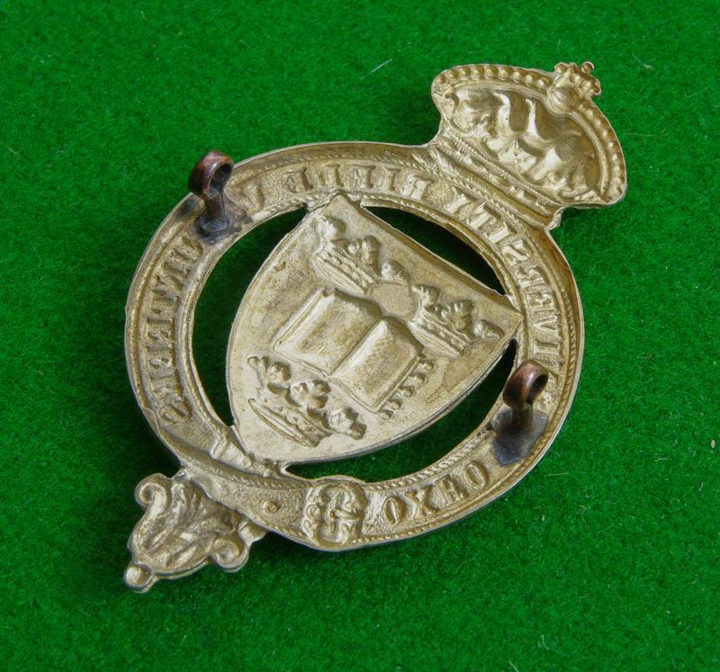 Victorian white metal glengarry badge with two loops to the reverse. A shield bearing the Arms of Oxford University to the centre of a crowned strap carrying the title. Redesignated 1st. {Oxford University} Volunteer Battalion Oxfordshire Light Infantry in 1887. 1st.V.B. became Oxford University O.T.C. in 1908}