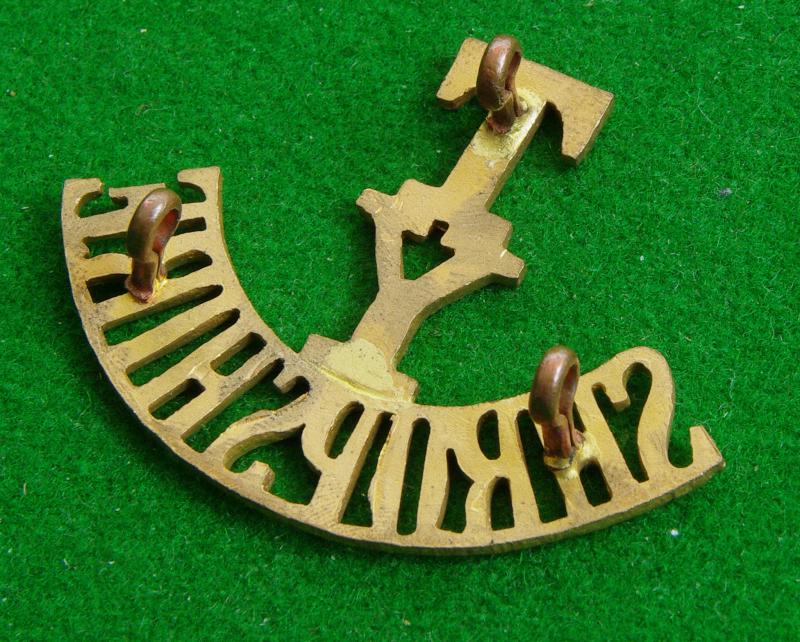 Brass shoulder title, "T / y / Shropshire"