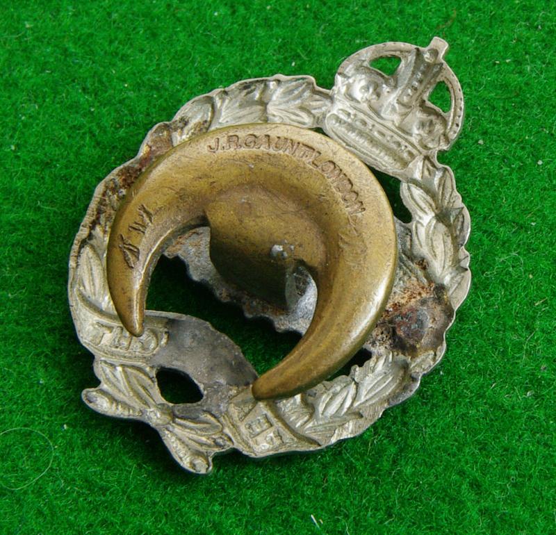 King's crown old comrade's small lapel badge with buttonhole fitting bearing makers details for Gaunt London to the reverse. A WW I style tank and the motto scroll to the centre of a crowned wreath of laurel. {officially converted collar badge}
