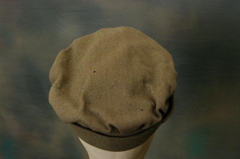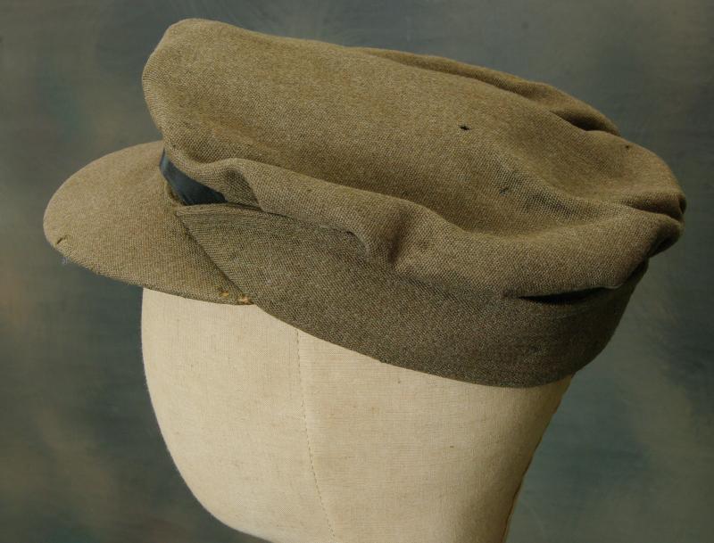 Officers khaki peaked cap of A.T.S. pattern with king's crown silver and gilt cap badge to the front and king's crown gilt buttons to the black chinstrap. The interior has a light brown silken lining with a drawstring tightening cord and a size label for 6 7/8ths. {Small moth nips to the crown and peak.}