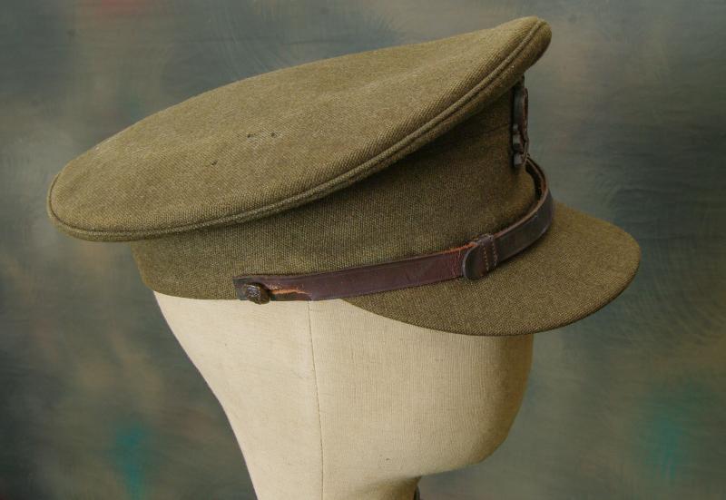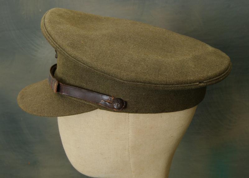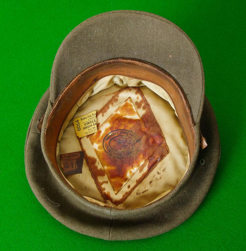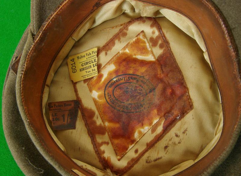 WW II officers khaki peaked forage cap unusually bearing a plastic economy issue cap badge to the front with bronze general service buttons to the brown leather chinstrap. The interior has a leather sweatband bearing size label of 6 7/8ths, a light brown silken lining with indistinct soiled makers details for a Liverpool uniform outfitters shop. When purchased a ticket stub for " Walton Vale Picture Palace" was discovered tucked into the sweatband!