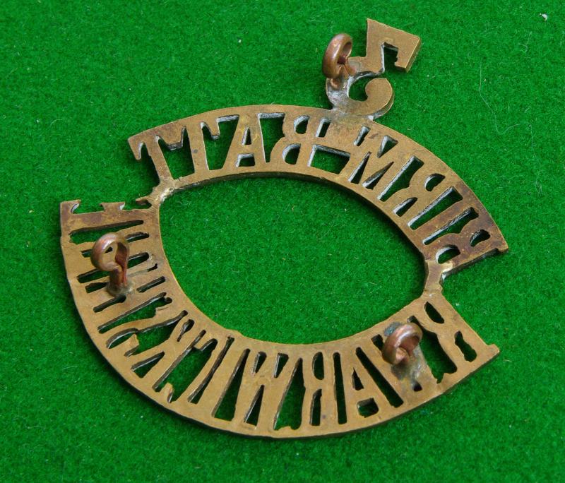 Scarce brass shoulder title, " 3 / Birm m Batt. / R.Warwickshire." Worn by the WW I raised Kitchener's Army " 3rd. Birmingham {16th.Service} Battalion Royal Warwickshire Regiment ".