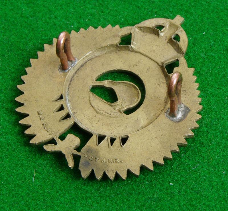King's crown bronzed-brass cap badge with two loops and makers details for "M & K Lt WCTN.N.Z." to the reverse. A Kiwi bird to the centre of a circlet bearing the title, " New Zealand Regiment" within a crowned wreath of fern.