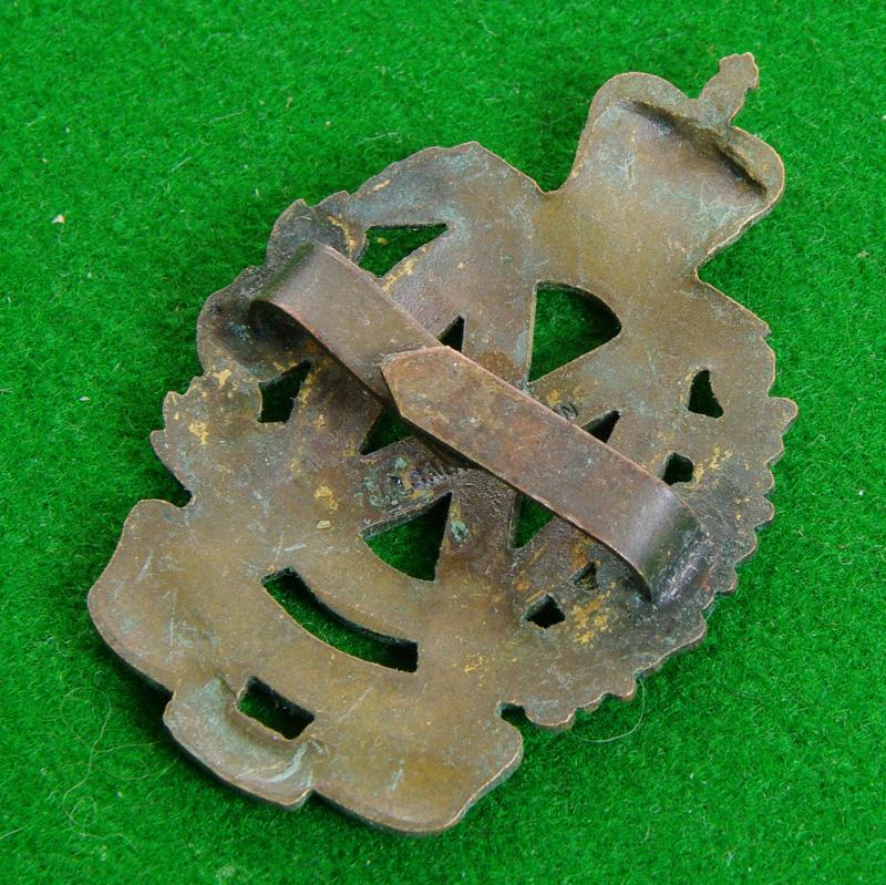 Scarce officers bronze service dress cap badge with two blades to the reverse. A saltire upon an oval bearing the title and the date,"1900" within a crowned wreath of bay and juniper above double scrolls carrying the South Africa honour.