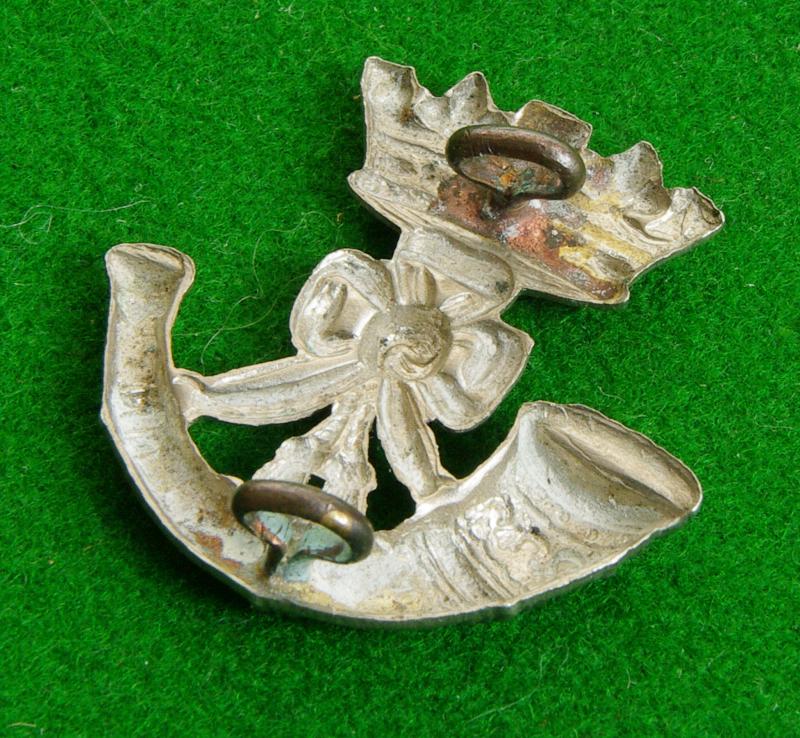 Scarce white metal small field service cap badge with two black loops to the reverse worn by the 2nd. Volunteer Battalion Duke of Cornwall's Light Infantry. A strung bugle horn surmounted by a Ducal Coronet.