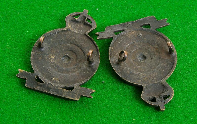 Pair of king's crown officers bronze service dress collar badges. The Yorkshire Rose to the centre of a crowned circlet bearing the full title above an angular scroll carrying the South Africa honour. { This large collar badge is often seen being sold as a cap badge}