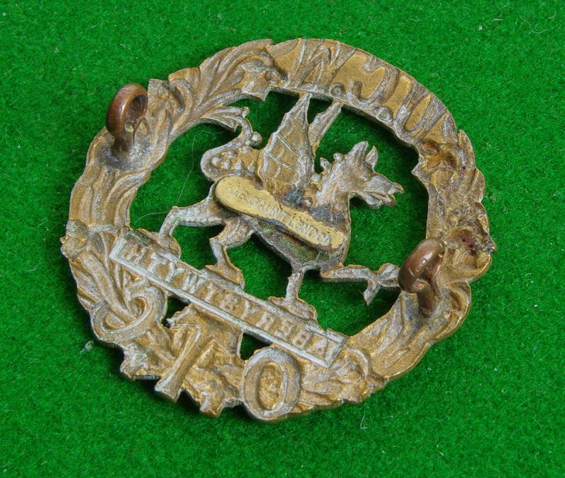 Scarce brass cap badge with two loops and makers details for Gaunt London to the reverse. The Welsh Dragon upon a tablet bearing, " Aberystwyth" to the centre of a wreath of daffodils carrying the " U C W " and " O T C " monograms.