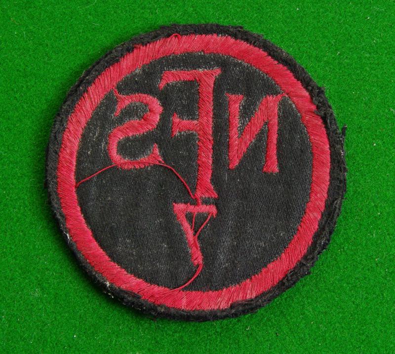 WW II embroidered tunic badge worn by firefighters from Allestree Derbyshire. The "NFS " monogram above the number, "7" in red on a black circular background.