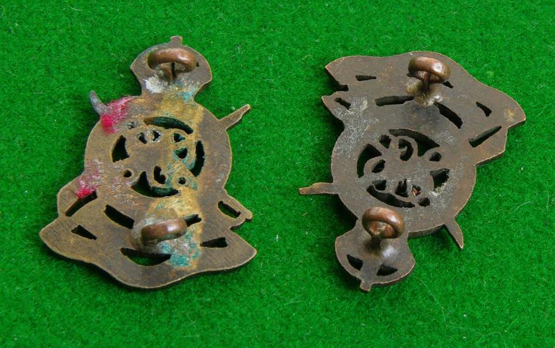 Scarce pair of king's crown officers bronze service dress collar badges. The cypher of GvR to the centre of a crowned Garter Strap backed by a crossed rifle and sword above double scrolls bearing the full titles.