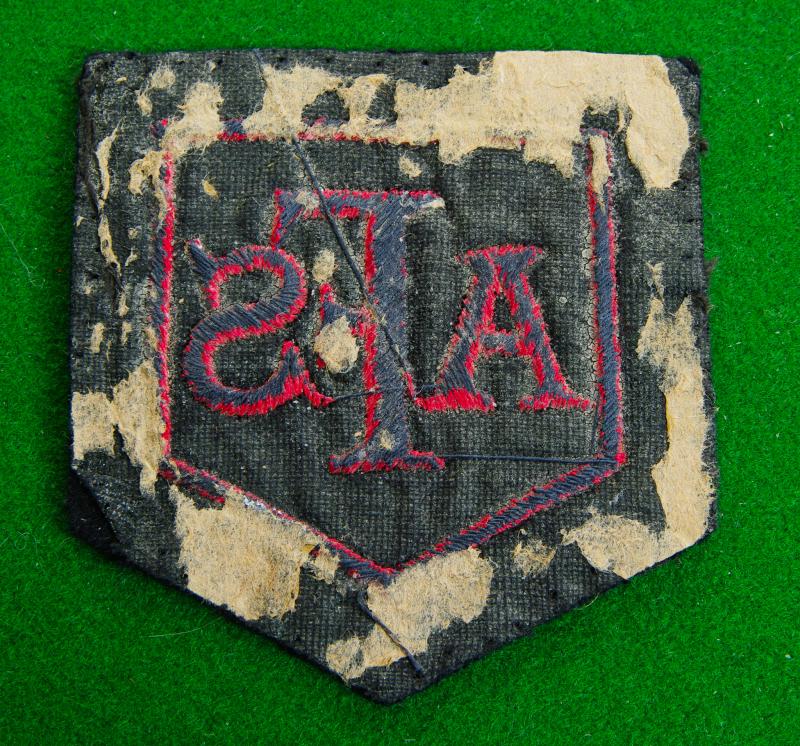 WW II embroidered tunic badge. The "AFS" monogram within a border in red on a black shield shape. {Paper stuck to reverse}