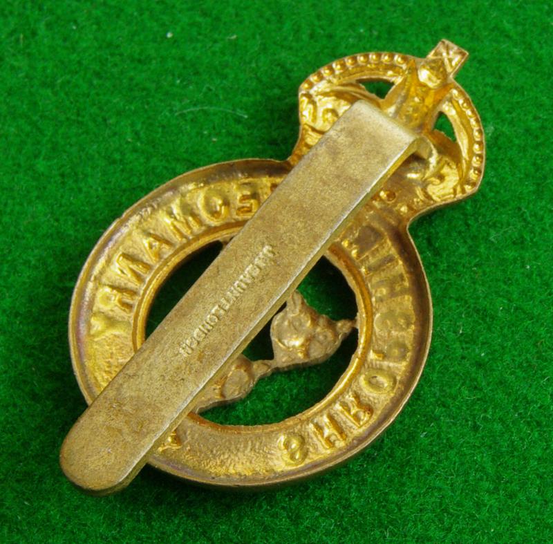 King's crown brass cap badge with slider fitting to the reverse bearing makers details for Gaunt London. Three leopard's faces to the centre of a crowned circlet bearing the title.