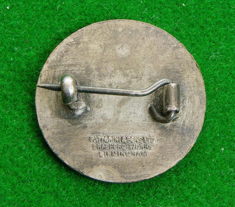 WW II white metal lapel badge with brooch pin fitting and makers details for Fattorini Birmingham to the reverse. A tank charging through a large letter, " V" within a circlet bearing, " Tanks Victory Club"
