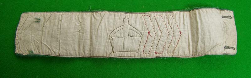Scarce WW I woollen embroidered armband with buttonhole fittings {buttons absent} and white material lining to the reverse. Three rank chevrons and the large king's crown in red on a dark green armband. {One or two moth nips}