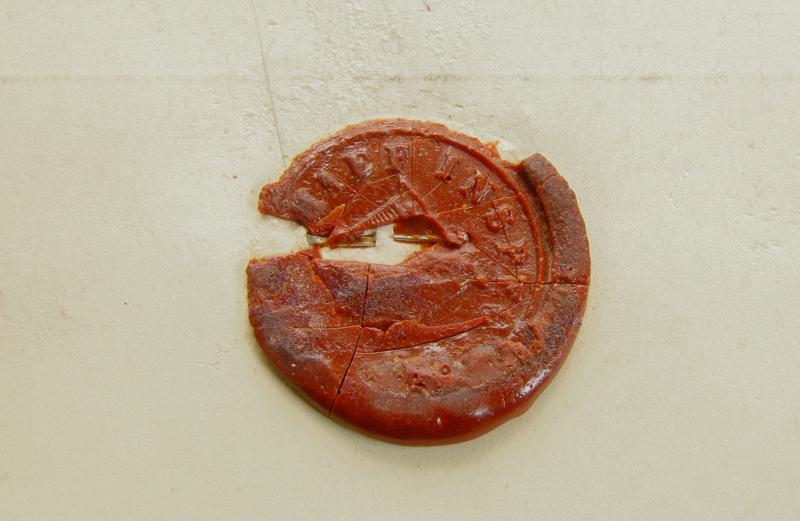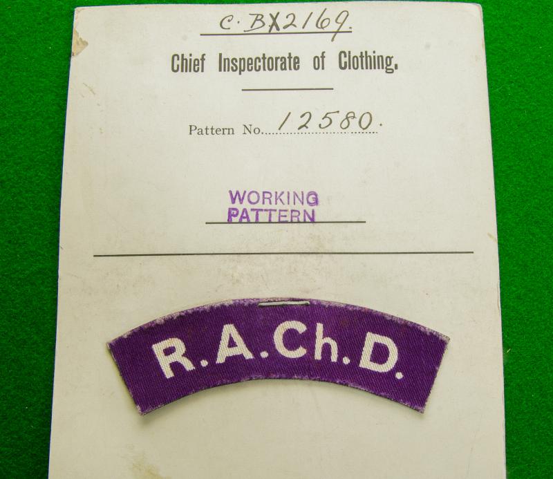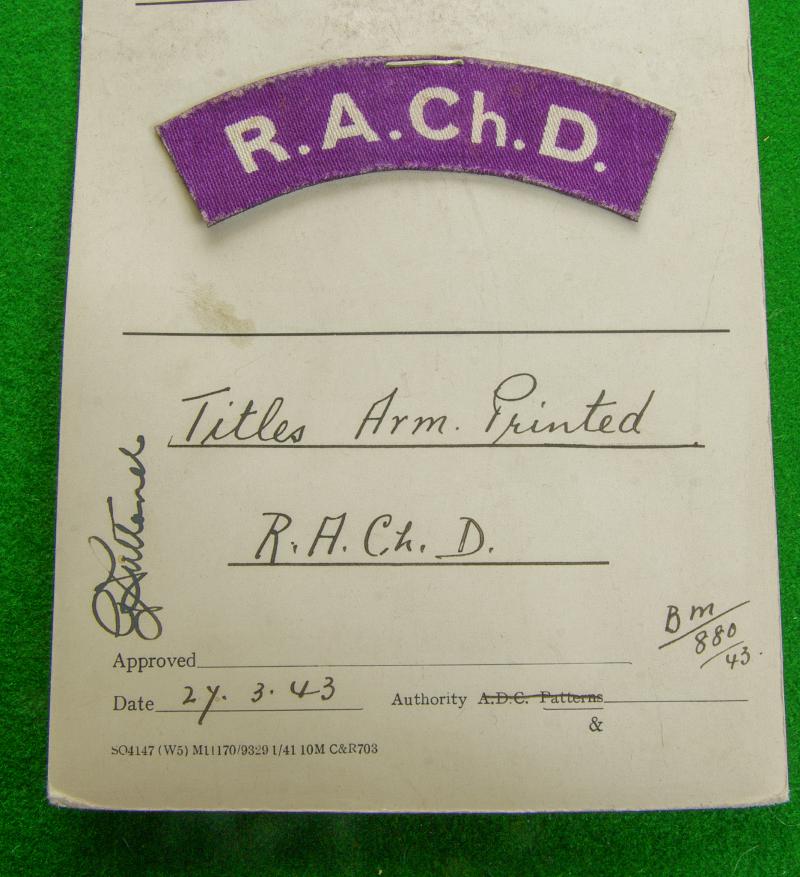 Very scarce WW II printed white on purple shoulder title still affixed to a 1943 dated Inspectorate of Clothing pattern card with wax seal to the reverse.