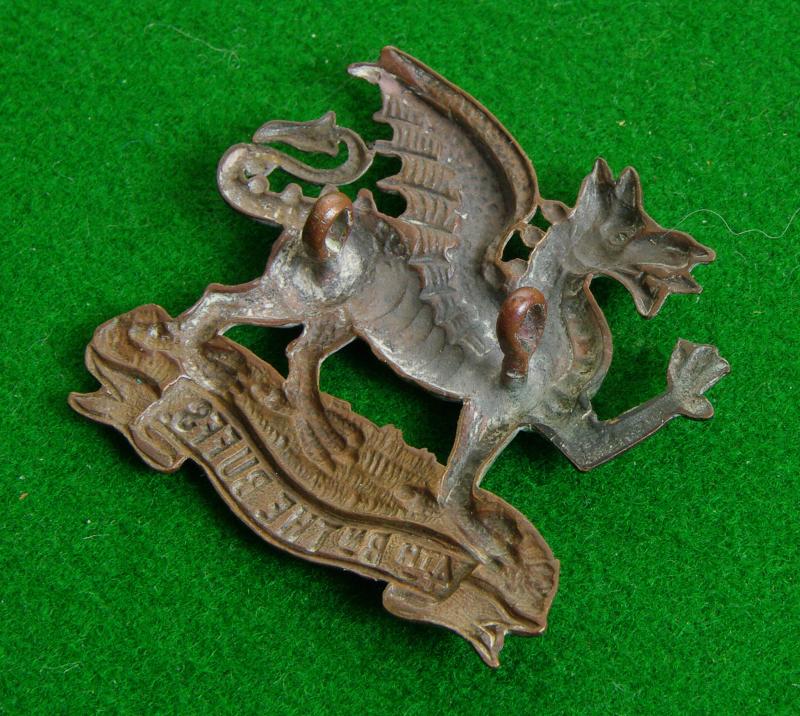 Very scarce brass cap badge with two loops to the reverse worn by the 4th.Territorial Battalion The Buffs {East Kent Regiment}. A dragon standing on ground above the furled scroll, " 4th. Bn. The Buffs"