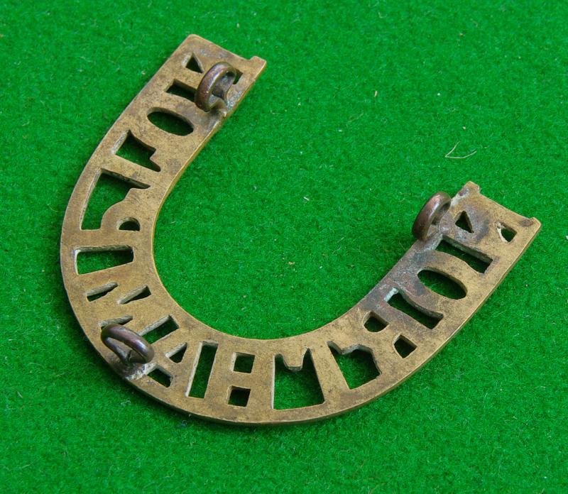 Scarce brass " horseshoe" pattern shoulder title with three loops to the reverse, " Northampton". Worn by the Regiment before 1902.
