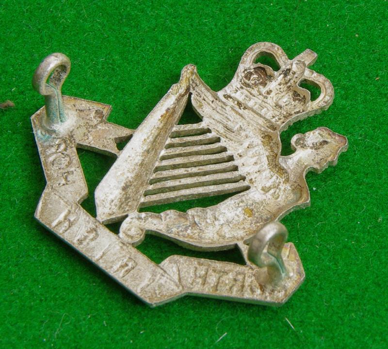 Queen's crown officers silvered cap badge with two long loops to the reverse. The crowned Angel Harp above the furled angular title scroll, " North Irish Horse"