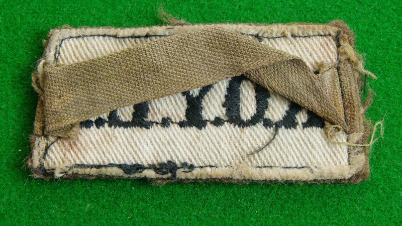 WW II black on khaki embroidered shoulder strap slip-on, " K.O.Y.L.I." with canvas loop to the reverse.