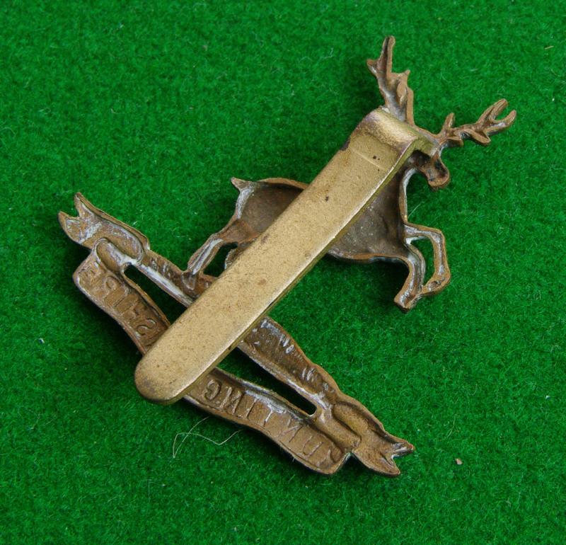 WW I brass cap badge with slider fitting to the reverse. A leaping stag on ground above the furled title scroll, " Huntingdonshire"