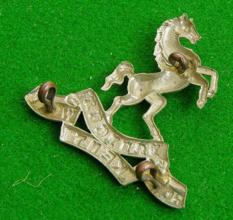 Victorian / Edwardian white metal cap badge with three loops to the reverse. The White Horse of Kent above the tri-part furled title scroll, " Royal West Kent£"