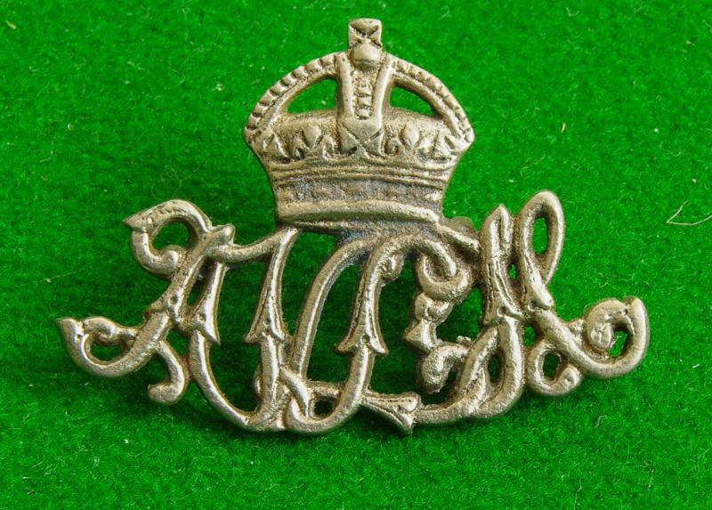 King's crown cast white metal cap badge with two integral lugs to the reverse worn by the Assam Valley Light Horse. The " A.V.L.H." monogram in script form surmounted by the crown.