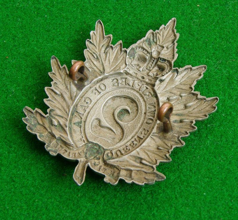 White metal Victorian headdress badge with two loops to the reverse. A maple leaf with the number, "2" to the centre of a crowned strap bearing the title and motto, "Queen's Own Rifles of Canada" and " In Pace Paratus".