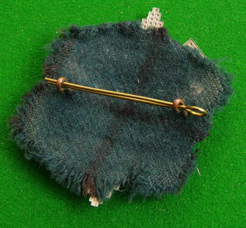 King's crown white metal glengarry badge with two loops and remains of original tartan backing to the reverse. St. Andrew upon the Star of the Order of the Thistle.
