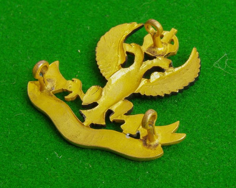 Superb quality king's crown officers black and gilt cap badge with three loops to the reverse. The double-headed eagle taken from the Arms of the Royal Burgh of Lanark surmounted by a crown above the furled title scroll, " Lanarkshire Yeomanry"