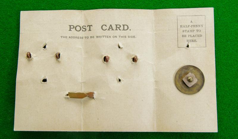Very rare set of officers bronze Brodrick cap and collar badges for the Isle of Wight Rifles -1902-1906 still attached to a London makers sample card. Originally the property of Colonel Hobart the first commanding officer of the Regiment. With the inauguration of the Territorial Force in 1908 he was appointed Lieutenant-Colonel commanding Princess Beatrice's Isle of Wight Rifles, {8th. Territorial Battalion} Hampshire Regiment. The cap badge depicts Carisbrooke Castle within a wreath of laurel with blade fittings, a similar design for the collars with the additional scroll, " Princess Beatrice's I of W" also on the card is a small, silvered bugle horn with screw bolt fitting.
