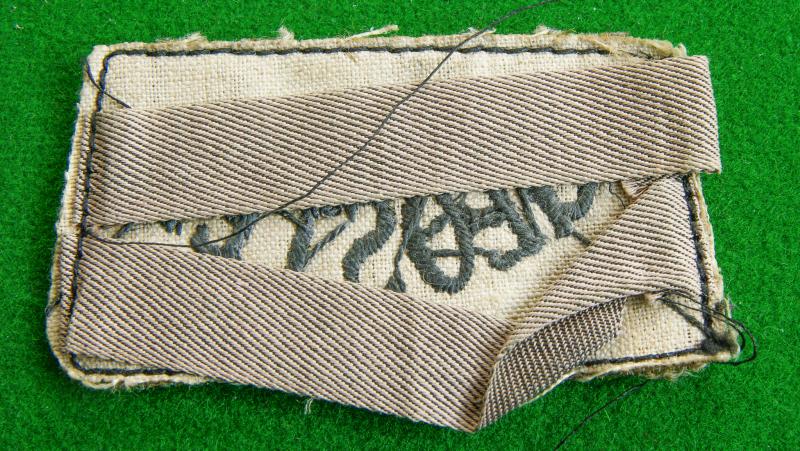 WW II embroidered in black on khaki shoulder strap slip-on, " Gloster" with two canvas loops to the reverse. {Moth nip to lower edge}